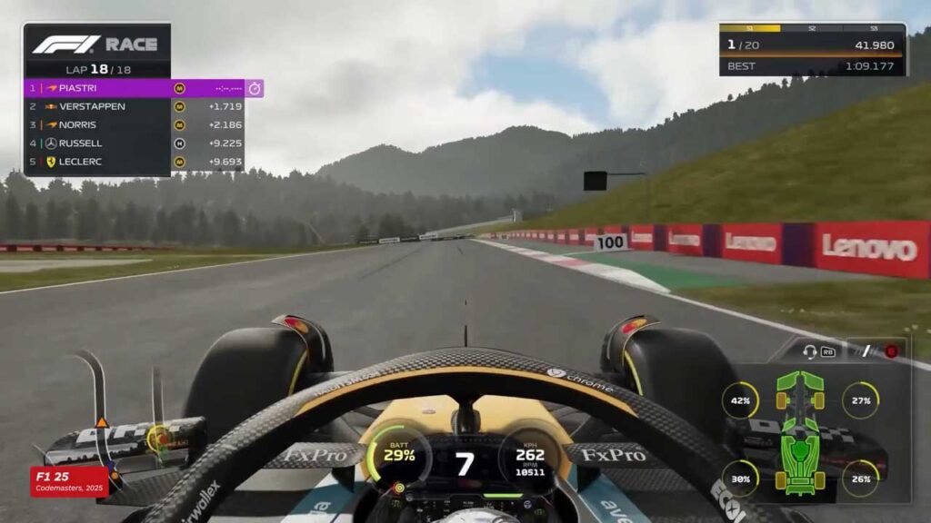 У грі немає гоночних траєкторій чи гальмівних траєкторій, тому нам доводиться розраховувати точний момент гальмування, щоб увійти в кожен поворот. Що ще гірше, знос шин стає помітнішим з кожним колом (як і очікувалося), тому ви не можете гальмувати в тій самій точці на першому колі, що й на четвертому, оскільки руйнування шини змінює точки гальмування та додає дуже цікаву схему контролю та точності.