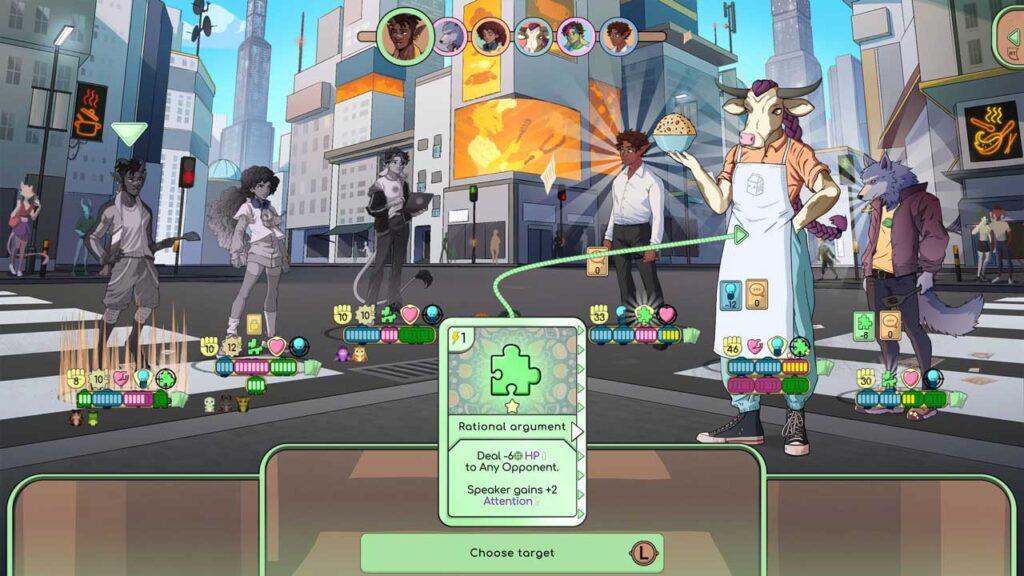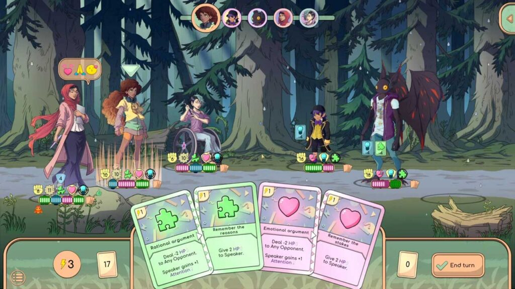 На перший погляд, KreatureKind має досить традиційну систему карт, подібну до Slay the Spire, але ситуація «три на три» вносить значні зміни до стратегії сценарію. Здоров’я представлено не числовим значенням, як у звичайному бою, а сіткою різнокольорових смужок, які називаються «гіпотезами». Зрештою, ми живемо в гармонійному суспільстві. Насильницьке насильство шкодить лише гармонії, а все інше — просто розмови.