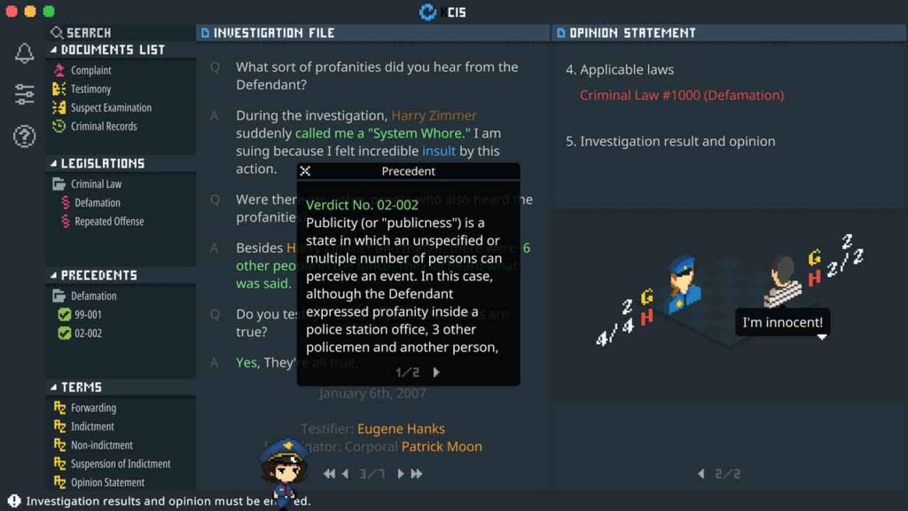 Справи, які вам надаються, процес їх розгляду ділиться на два етапи: збір інформації та допит бажаних підозрюваних. На першому етапі ваш обов’язок — відповісти на основні запитання щодо справи: наприклад, яка робота підозрюваного, який злочин він скоїв, які його мотиви для цього. Щоб отримати відповіді на ці запитання та знайти інформацію, необхідно уважно вивчити та вивчити всі звіти.