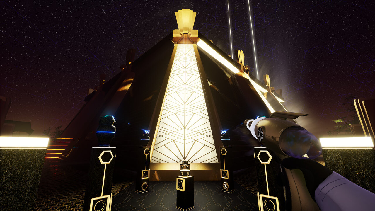 Головоломки важко описати, але всі вони починаються відносно просто і переходять до більш складних ситуацій у міру просування. Один із прикладів полягає в тому, що вам потрібно зіставити деякі символи в кімнаті, повернувши перемикачі та розблокувавши двері виходу. Але потім вони дають вам свій дуже корисний пристрій, який я люблю називати «присоскою». Це пістолет, який поглинає світло синіх або оранжевих інопланетних скульптур, які розміщені навколо поверхонь, і дозволяє стріляти світлом, щоб активувати двері, вимикачі, платформи та подушки. У вас є лише один заряд, один помаранчевий вмикає все, а інший синій підключає джерела живлення. Написано це звучить складно, але користуватися ним досить інтуїтивно. Однак він все ще має високий рівень складності, і бувають випадки, коли ви чухаєтесь і безцільно шукаєте рішення.
